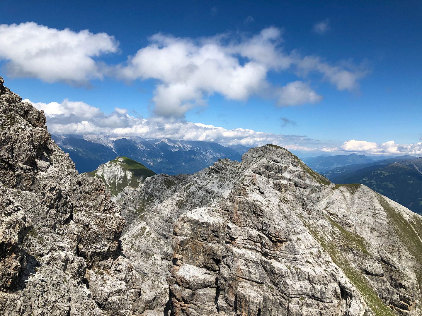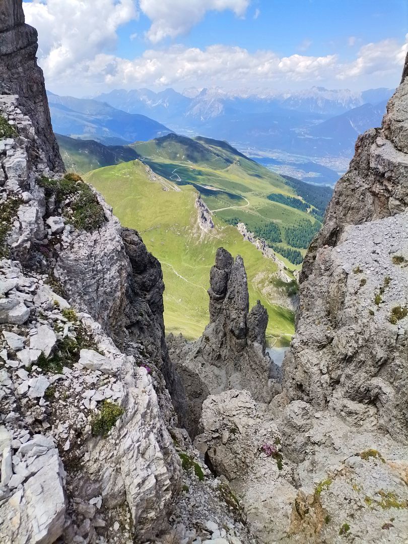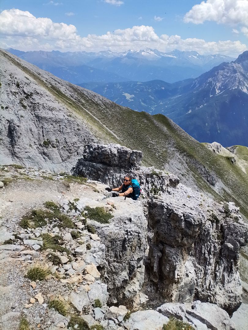 Alternativer Abstieg: Ab Marchreisengipfel südlich Richtung Stubaital abwärts und wieder aufwärts bis zur Malgrubenscharte – von dort entweder links ins Stubaital oder rechts über steile Schotterreisen ins Tal der Axamer Lizum.