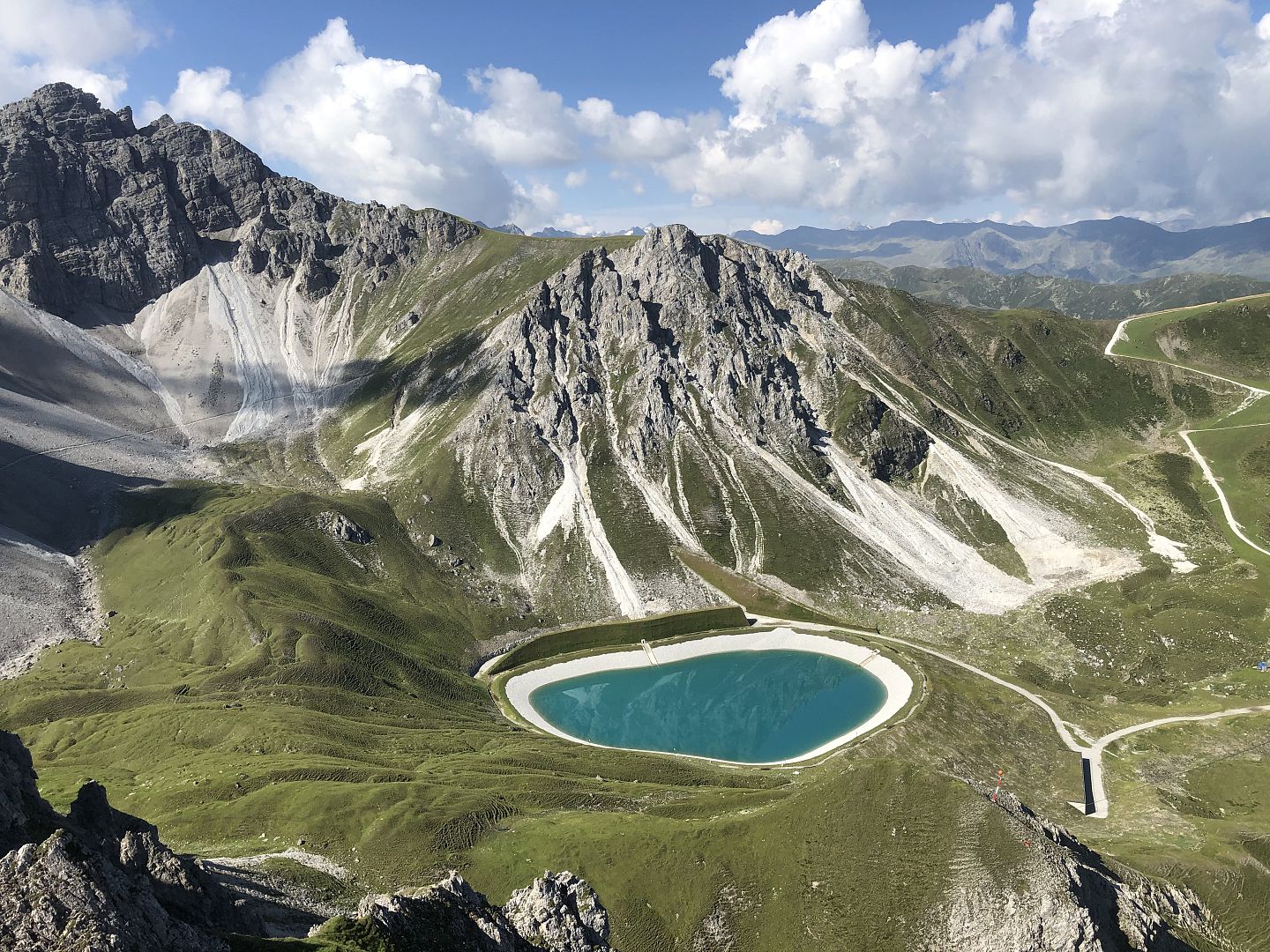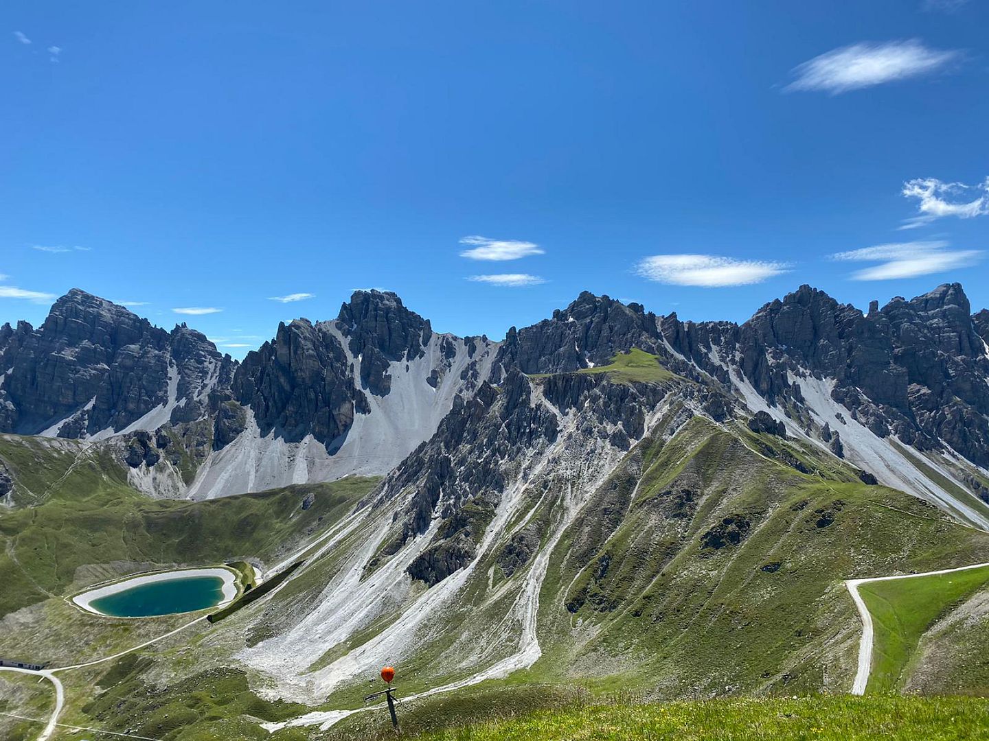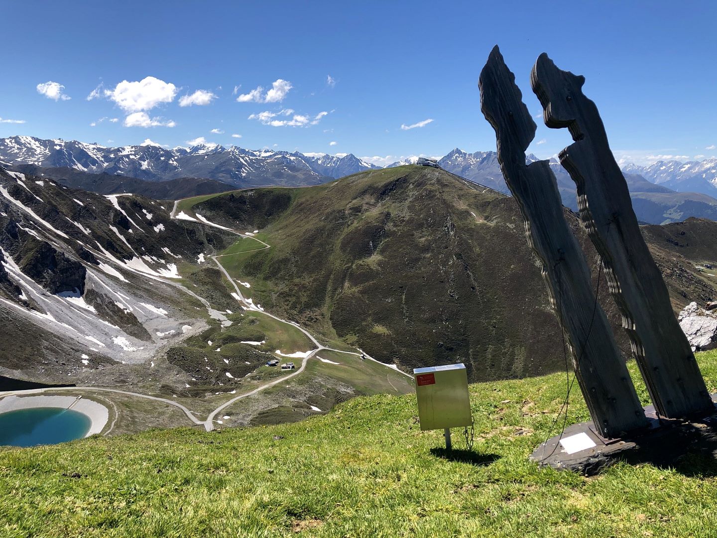 Vom Gipfel des Hoadl 2.340 m führt eine breite Schotterstraße hinab bis zum Dohlennest auf ca. 2.100 m. Etwas oberhalb vom Dohlennest befindet sich der Herzlteich.