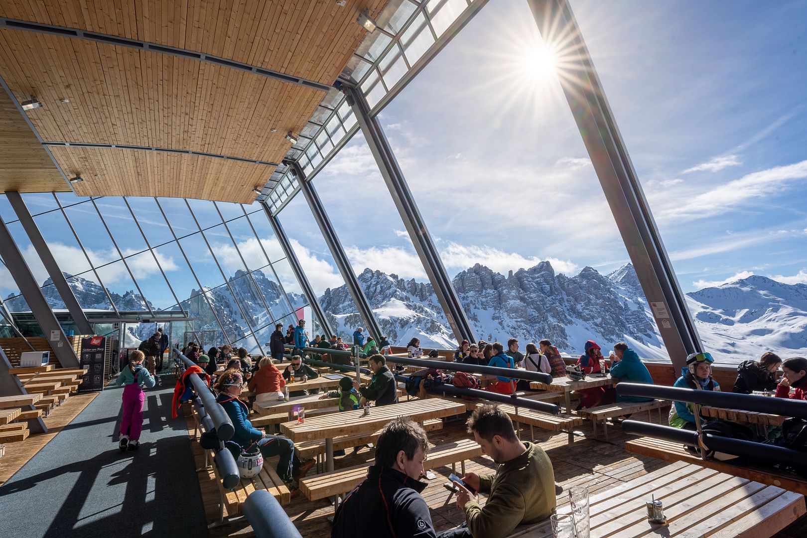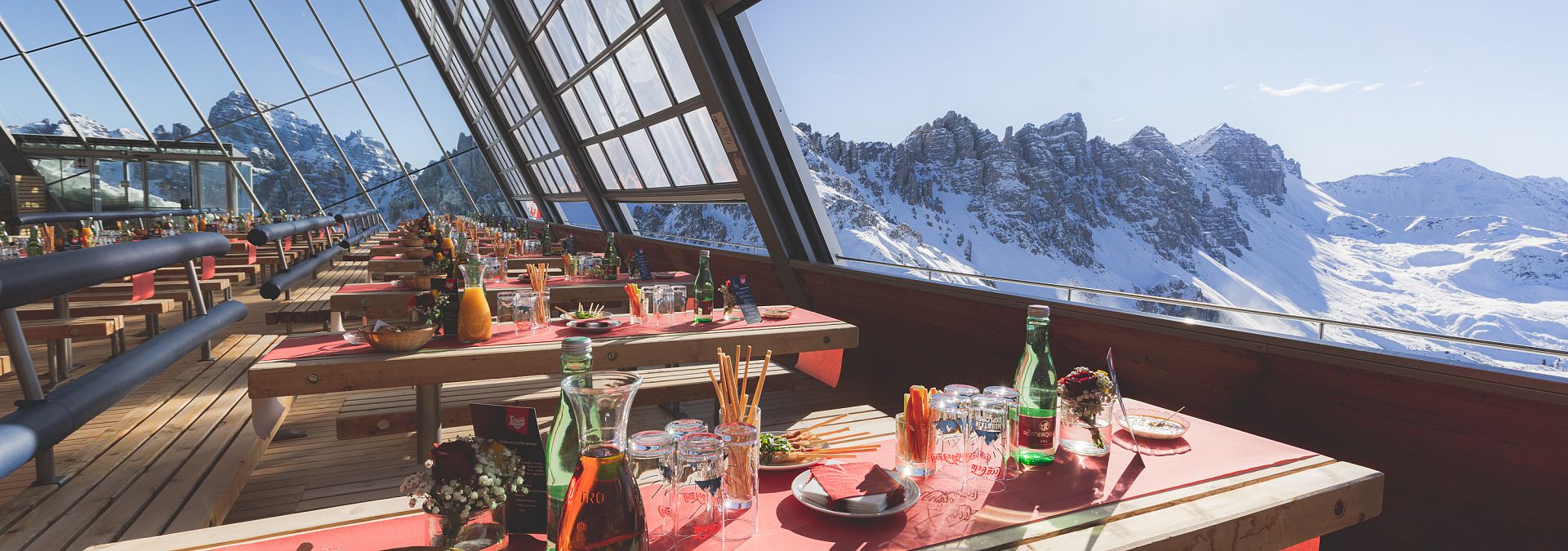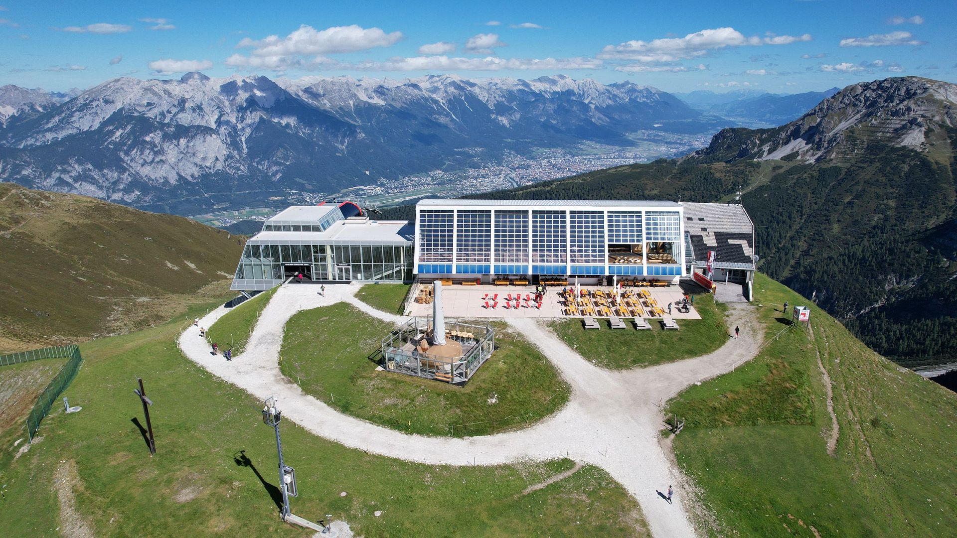 Von der neuen 10er-Gondelbahn direkt ins Panoramarestaurant Hoadl-Haus mit der größten überdachten Sonnenterrasse Österreichs auf 2.340 m: